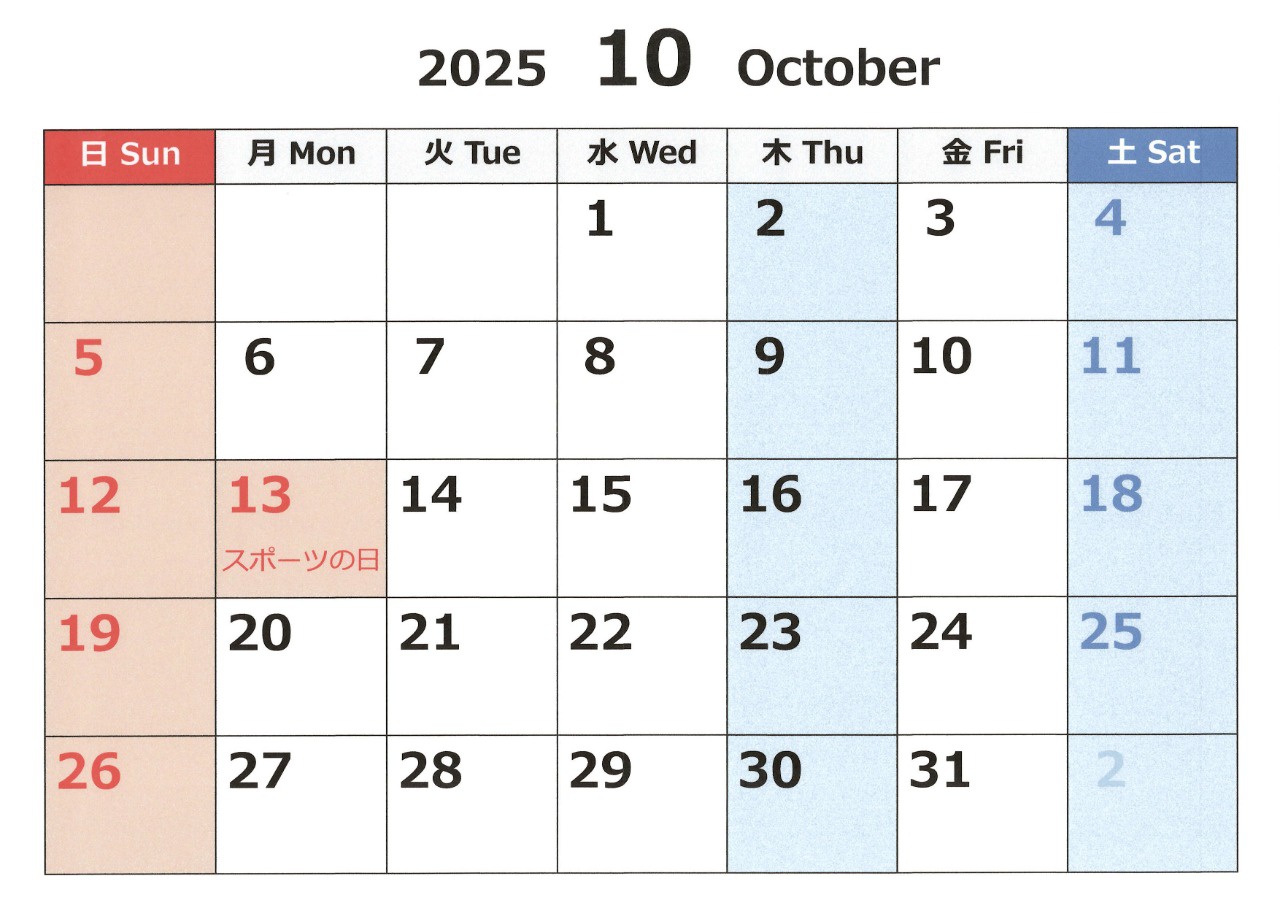 2025年10月の休診日は、通常の休診日(日曜、木曜・土曜の午後)及び