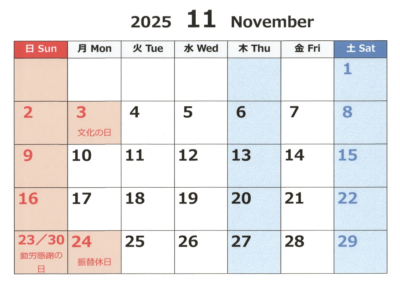 2025年11月の休診日は、通常の休診日(日曜、木曜・土曜の午後)及び