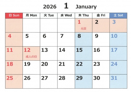1月1日(木)元日、1月2日(金)、1月3日(土)、1月12日(月)成人の日 です。