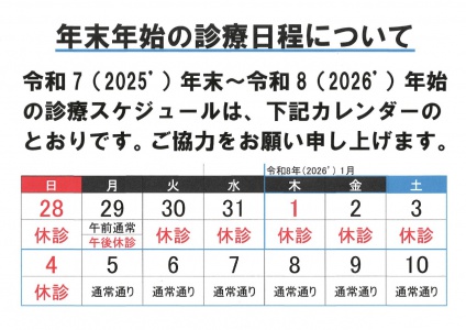 当院の2025年末~2026年始の診療日程について、お知らせします。